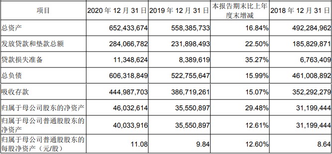 截至2020年末,成都银行的总资产为6524.34亿元,比上年末增长16.84%,其中发放贷款和垫款总额为2840.67亿元,比上年末增长22.50%;总负债为6063.19亿元,比上年末增长15.99%,其中吸收存款4449.88亿元,比上年末增长15.07%。