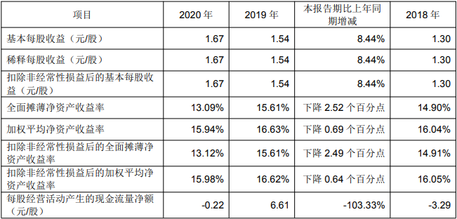 2020年,成都银行基本每股收益为1.67元/股,同比增长8.44%;加权均匀净资产收益率为15.94%,上年同期下降0.69个百分点;扣除非经常性损益后的片面摊薄净资产收益率为13.12%,上年同期下降2.49个百分点;扣除非经常性损益后的加权均匀净资产收益率为15.98%,上年同期下降0.64个百分点。