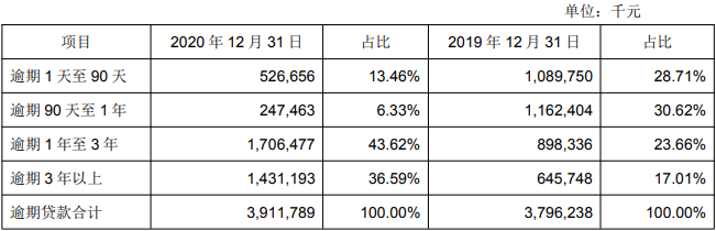 截至2020年末,成都银行逾期贷款合计39.12亿元,上年同期为37.96亿元。其中,逾期1天至90天贷款金额为5.27亿元,逾期90天至1年贷款金额为2.47亿元,逾期1年至3年贷款金额为17.06亿元,逾期3年以上贷款金额为14.31亿元。
