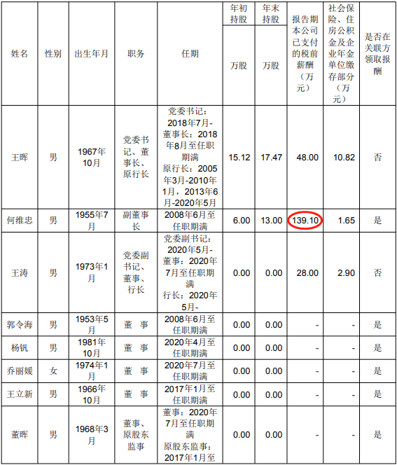 2020年,成都银行已领取董事、监事和高级管理人员的税前薪酬合计947.11万元,其中一人税前薪酬超百万,副董事长何维忠的税前薪酬为139.10万元。