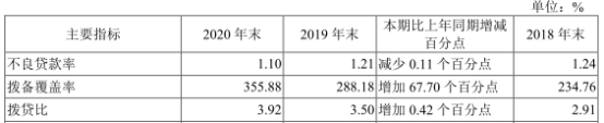 2020年,无锡银行不良贷款余额为10.98亿元,不良贷款率1.10%,分别较上年末添加0.68亿元、减少0.11个百分点;拨备覆盖率为355.88%,比上年同期添加67.70个百分点。