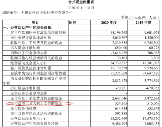 2020年,无锡银行领取给职工及为职工领取的现金为5.24亿元,上年同期为5.15亿元。