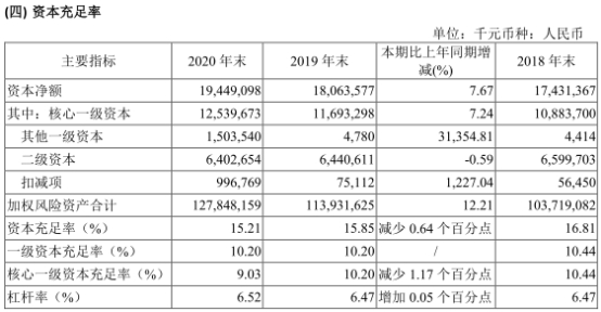 资本充足率方面,截至2020年末,无锡银行资本充足率为15.21%,比上年末减少0.64个百分点;一级资本充足率为10.20%,同上年末持平;核心一级资本充足率为9.03%,比上年末 减少1.17个百分点。