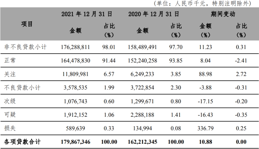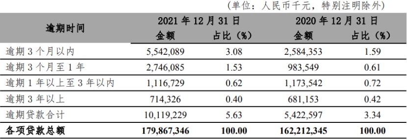 截至2021年12月31日,富滇银行逾期贷款合计101.19亿元,占比5.63%,上年末为54.23亿元,占比3.34%。