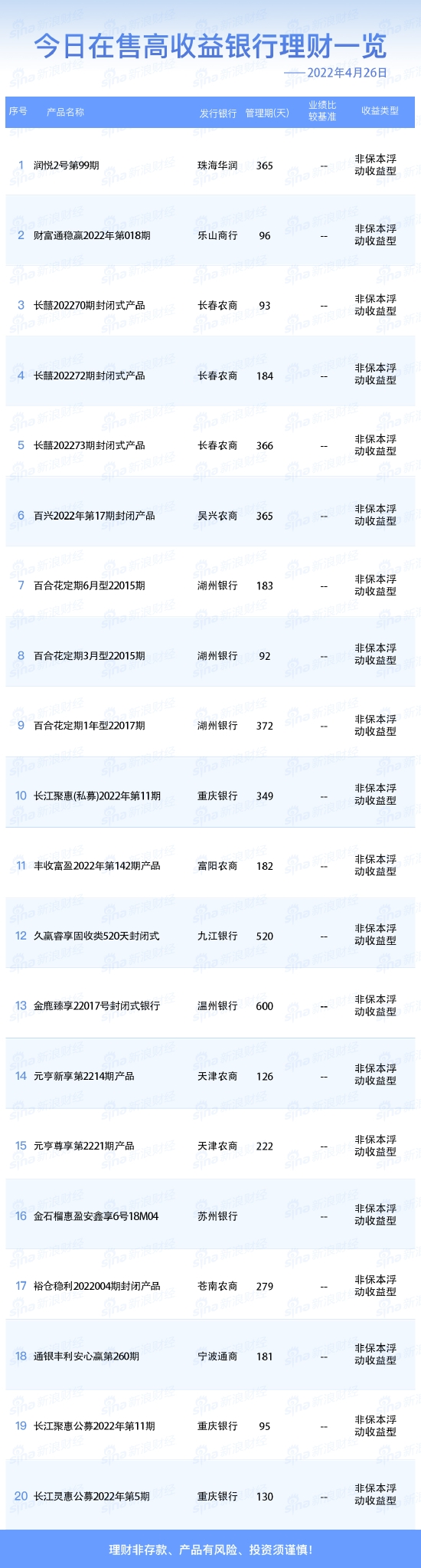 新浪财经4月26日在售高收益银行理财产品一览。理财非存款、产品有风险、投资须谨慎!