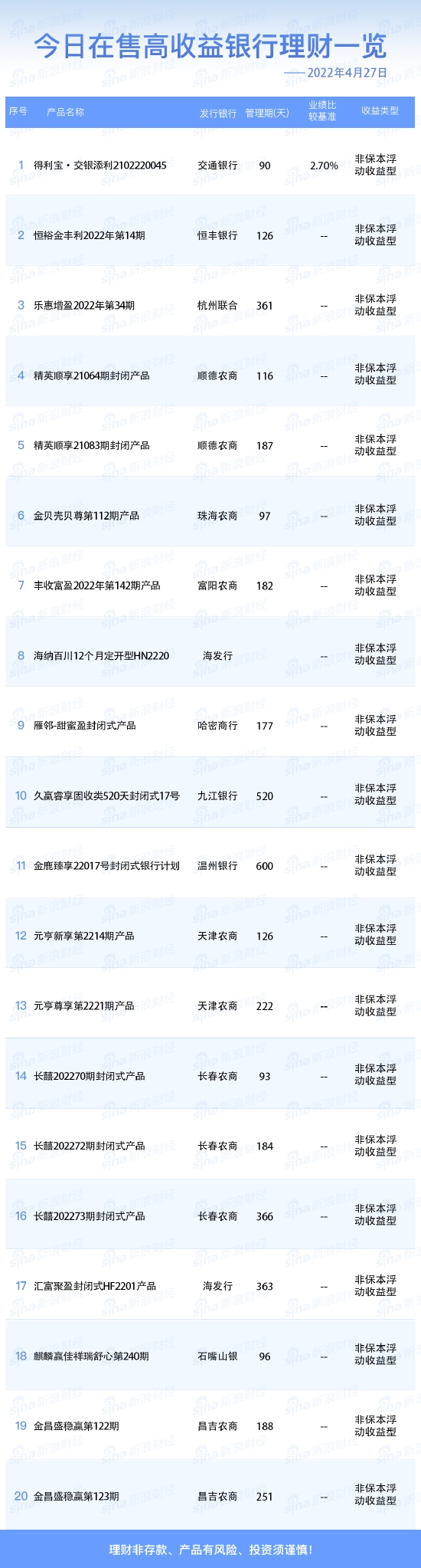 银行4月27日在售高收益理财产品一览