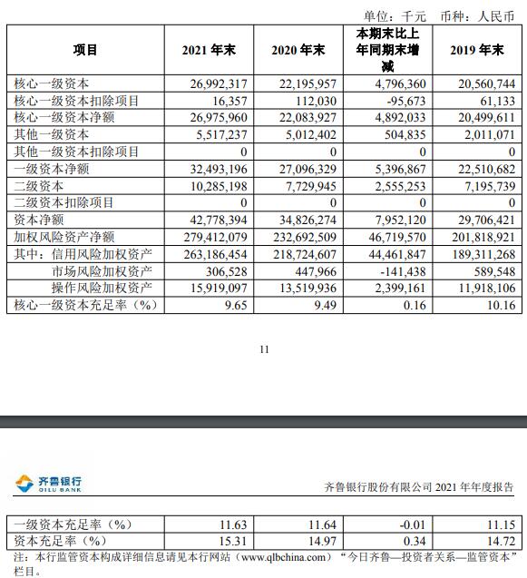 2021年末,齐鲁银行资本充足率15.31%,比上年同期末增长0.34个百分点;一级资本充足率11.63%,比上年同期末减少0.01个百分点;核心一级资本充足率9.65%,比上年同期末增长0.16个百分点。