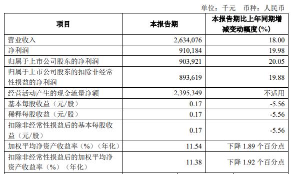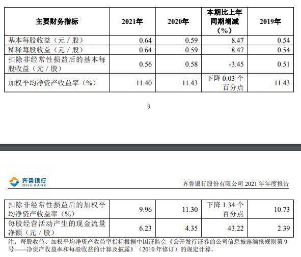 2021年,齐鲁银行基本每股收益0.64元/股,同比增长8.47%;加权均匀净资产收益率11.40%,比上年同期下降0.03个百分点;扣除非经常性损益后的加权均匀净资产收益率9.96%,比上年同期下降1.34个百分点。