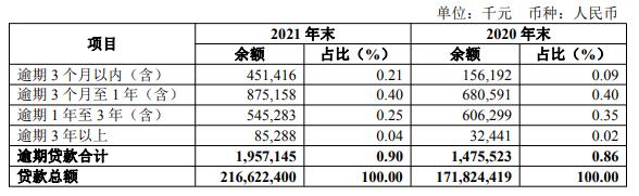 2021年末,齐鲁银行逾期贷款合计19.57亿元,较上年末添加4.82亿元,逾期贷款占贷款总额比例为0.90%,较上年末添加0.04个百分点,新增逾期贷款次要由部分存量不良贷款借款人还款志愿下降而构成,逾期贷款规模全体可控。