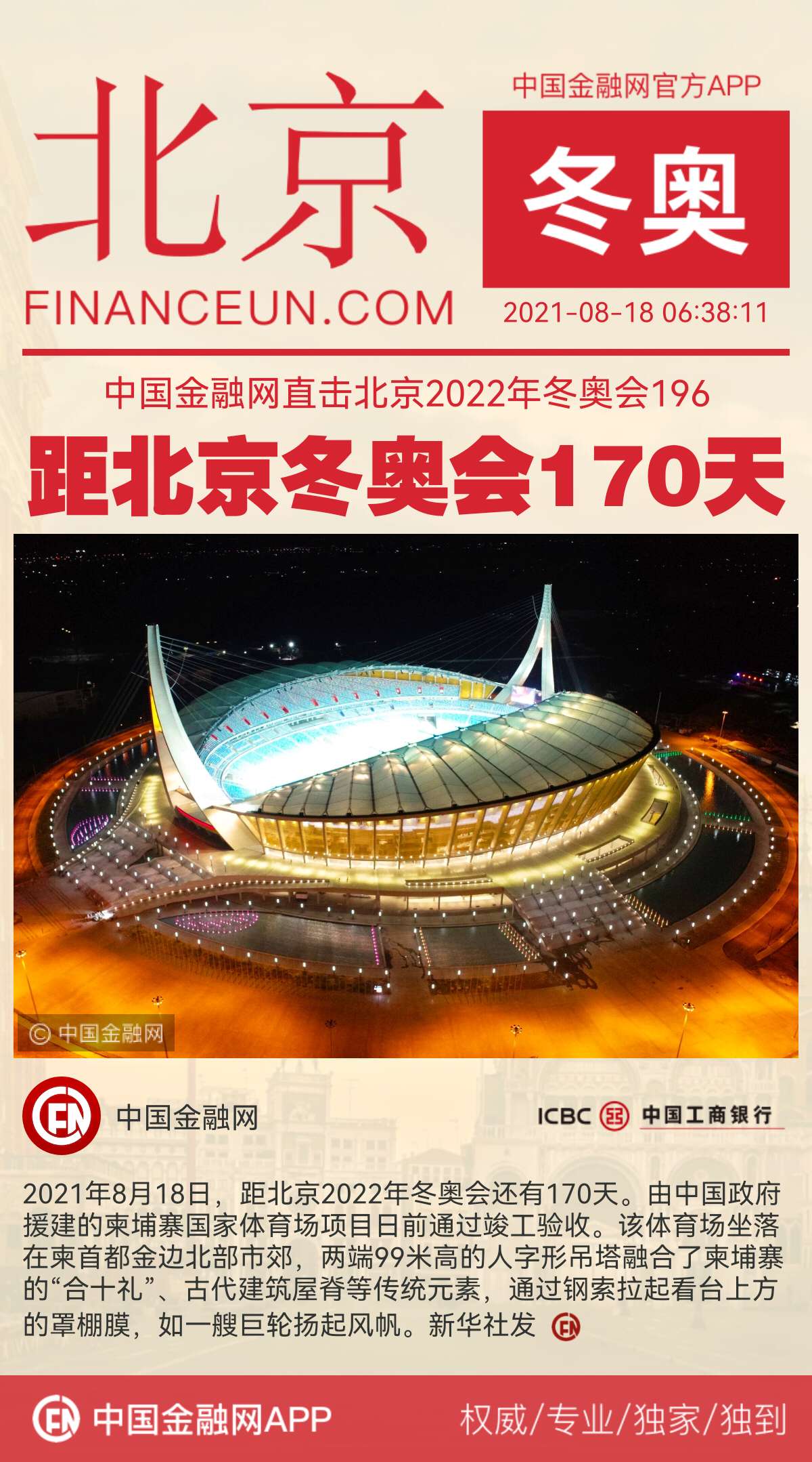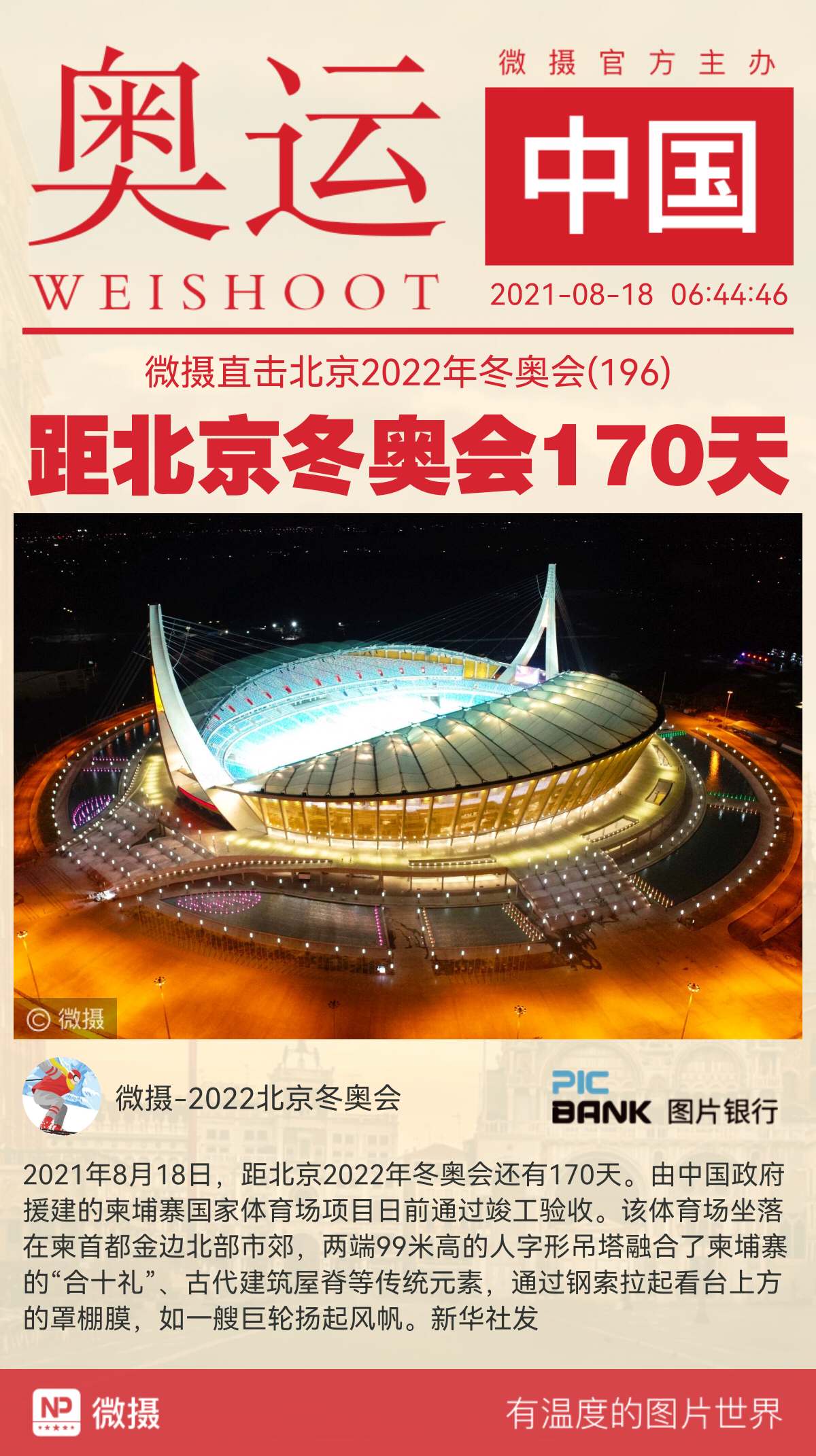 2021年8月18日,距350vip葡亰集团2022年冬奥会还有170天。由中国政府援建的柬埔寨国家体育场项目日前经过竣工验收。该体育场坐落在柬首都金边北部市郊,两端99米高的人字形吊塔交融了柬埔寨的“合十礼”、古代建筑屋脊等传统元素,经过钢索拉起看台上方的罩棚膜,如一艘巨轮扬起风帆。新华社发