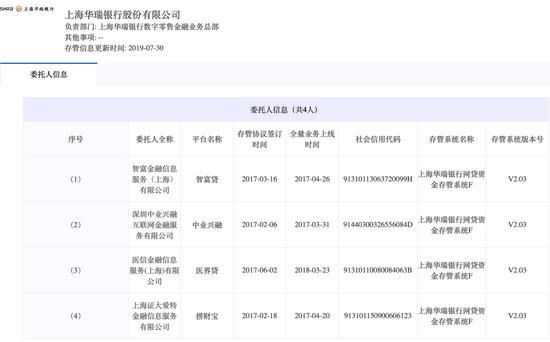 根据中国互联网金融协会信息披露零碎信息显示,截至2019年7月30日,华瑞银行共为4家网贷平台提供资金存管服务,分别为智富贷、中业兴融、医界贷、捞财宝。