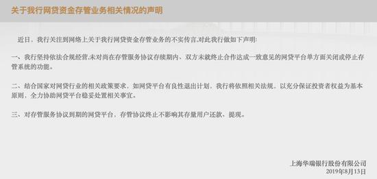 之后,在8月13日,上海华瑞银行发宣称,关注到网络上关于我行网贷资金存管业务的不实传言,对此做如下声明: