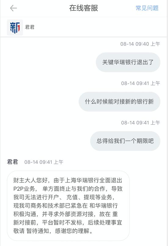 2019年8月1日,新新贷收到了上海华瑞银行股份有限公司发来的《关于终止存管业务合作的告知函》,告知函中明确表明:华瑞银行与新新贷签署的资金存管协议即日起终止(新新贷与华瑞银行的存管协议正常要到2020年2月6日才到期),并自2019年8月6日起陆续中止对新新贷的资金存管账户及零碎服务。