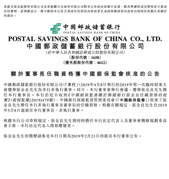 邮储银行:郭新双行长任职资历已获银保监会核准