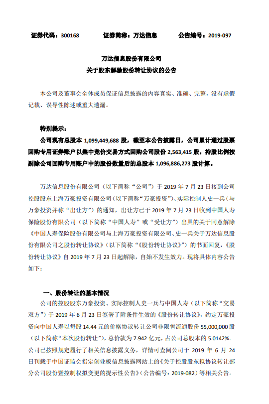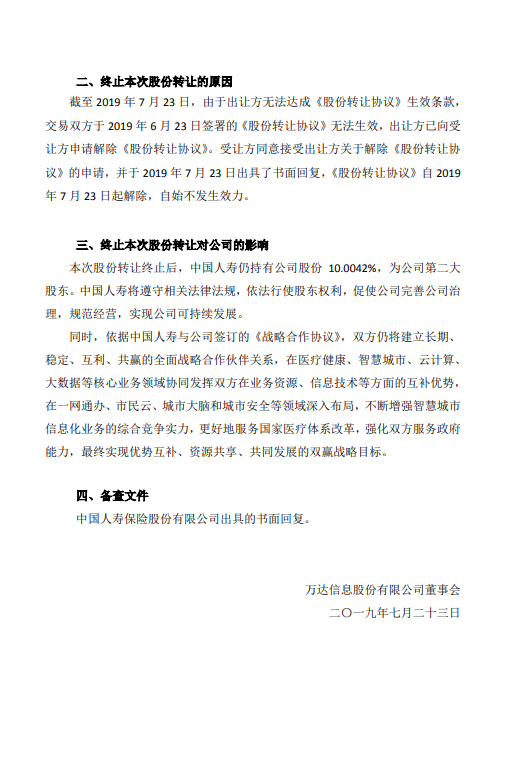 万达信息公告显示,公司控股股东万豪投资、实控人史一兵此前与中国人寿签署附条件失效的股份转让协议,商定万豪投资向中国人寿转让公司5.01%股份。截至7月23日,由于出让方无法达成《股份转让协议》失效条款,买卖单方于此前签署的《股份转让协议》无法失效,万豪投资已向中国人寿恳求解除《股份转让协议》。中国人寿赞同接受关于解除《股份转让协议》的恳求,并于7 月23日出具了书面回复,《股份转让协议》自7月23日起解除,自始不发失效能。