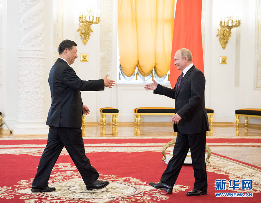 6月5日,国家主席习近平在莫斯科克里姆林宫同俄罗斯总统普京会谈。这是两国元首在会谈前握手。 新华社记者 李学仁 摄