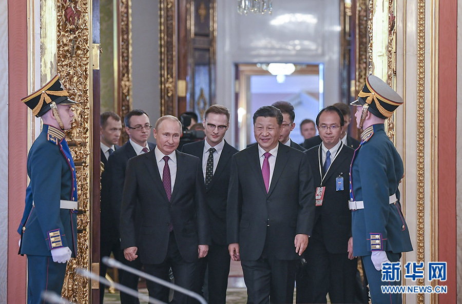 6月5日,国家主席习近平在莫斯科克里姆林宫同俄罗斯总统普京会谈。这是两国元首步入会场。 新华社记者 谢环驰 摄