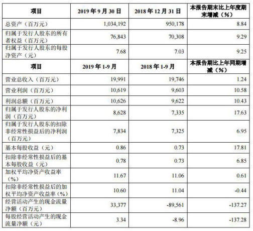 截至2019年9月30日,渝农商行资产总额为10341.92亿元,较2018年末增长8.84%。2019年1-9月,渝农商行完成营业支出199.91亿元,同比增长1.24%;完成归属于该行股东的净利润86.29亿元,同比增长17.63%。