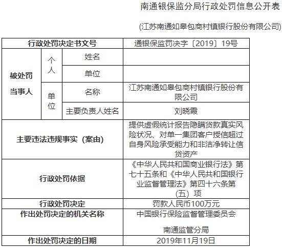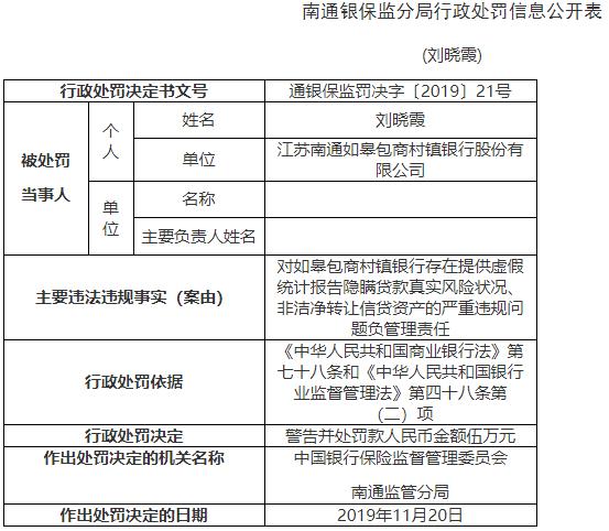 刘晓霞对如皋包商村镇银行存在提供虚伪统计报告隐瞒贷款真实风险状况、非洁净转让信贷资产的严重违规成绩负管理责任。根据《中华人民共和国商业银行法》第七十八条和《中华人民共和国银行业监督管理法》第四十八条第(二)项,中国银行保险监督管理委员会南通监管分局对其警告并处?钊嗣癖医鸲5万元。