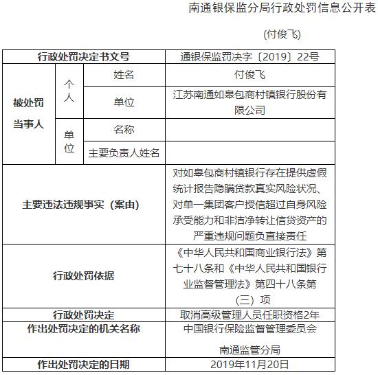 付俊飞对如皋包商村镇银行存在提供虚伪统计报告隐瞒贷款真实风险状况、对单一350vip葡亰集团350vip葡亰集团350vip葡亰集团集团客户授信超过本身风险承受才能和非洁净转让信贷资产的严重违规成绩负直接责任。根据《中华人民共和国商业银行法》第七十八条和《中华人民共和国银行业监督管理法》第四十八条第(三)项,中国银行保险监督管理委员会南通监管分局对其作出取消高级管理人员任职资历2年的行政处罚决定。