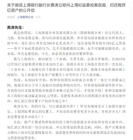新浪财经讯 1月10日音讯,上海申鑫足球俱乐部老板、上:庠雌笠350vip葡亰集团有限公司法人徐国良今日经过企业公众号“上:庠雌笠怠狈⒈砉,举报上海银行副行长黄涛,“敦促其立即自首并归还百亿资产”。