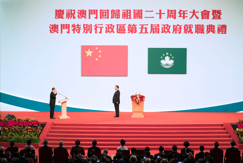 12月20日,庆�澳门回归祖国20周年大会暨澳门特别行政区第五届政府就职仪式在澳门东亚运动会体育馆浩大举行。中共地方总书记、国家主席、地方军委主席习近平出席并发表重要讲话。由习近平监誓,澳门特别行政区第五届政府次要官员在澳门特区第五任行政长官贺一诚带领下宣誓就职。新华社记者 鞠鹏 摄