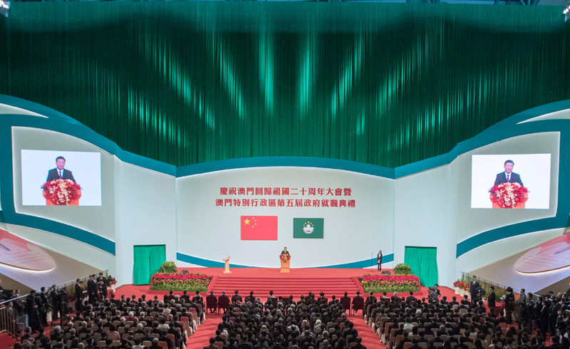 12月20日,庆�澳门回归祖国20周年大会暨澳门特别行政区第五届政府就职仪式在澳门东亚运动会体育馆浩大举行。中共地方总书记、国家主席、地方军委主席习近平出席并发表重要讲话。新华社记者 李涛 摄