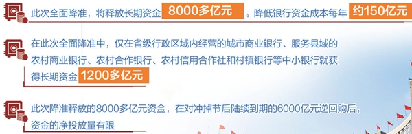 此次片面降准,将释放长期资金8000多亿元。在此次片面降准中,仅在省级行政区域内运营的城市商业银行、服务县域的乡村商业银行、乡村合作银行、乡村信誉合作社和村镇银行等中小银行就获得长期资金1200多亿元,有利于加强立足当地、回归本源的中小银行服务小微企业、民营企业的资金实力。