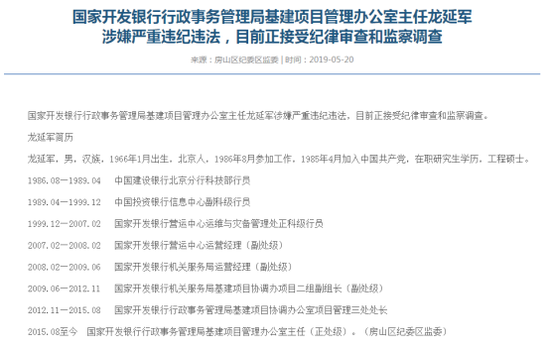 2019年5月20日,350vip葡亰集团市纪委监察网公布信息显示,国家开发银行行政事务管理局基建项目管理办公室主任龙延军涉嫌严重违纪违法,目前正接受纪律审查和监察调查。