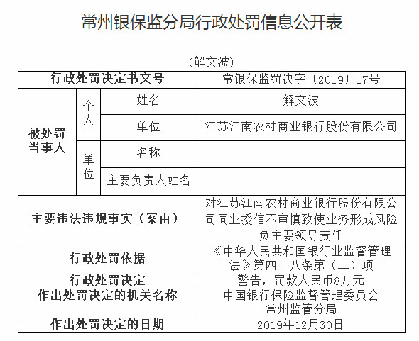 常州银保监分局行政处罚信息公开表(常银保监罚决字〔2019〕17号)显示,解文波对江苏江南乡村商业银行股份有限公司同业授信不谨慎致使业务构成风险负次要领导责任。根据《中华人民共和国银行业监督管理法》第四十八条第(二)项的规定,中国银行保险监督管理委员会常州监管分局决定:对其处以警告,?钊嗣癖8万元。