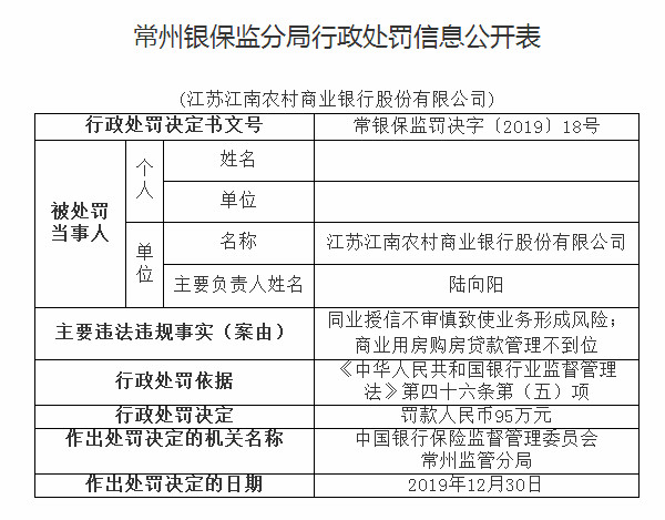 2019年1月,银保监会网站公布行政处罚信息公开表(常银保监罚决字〔2018〕1号、2号、3号)显示,江苏江南乡村商业银行股份有限公司常州市金坛支行存在信贷业务审查严重不尽职的违法行为,被中国银行保险监督管理委员会常州监管分局?钊嗣癖30万元。此外,崔国富、于祥两名相关责任人被!