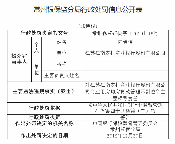 常州银保监分局行政处罚信息公开表(常银保监罚决字〔2019〕19号)显示,陆诗俊对江苏江南乡村商业银行股份有限公司商业用房购房贷款管理不到位负次要领导责任。根据《中华人民共和国银行业监督管理法》第四十八条第(二)项的规定,中国银行保险监督管理委员会常州监管分局决定:对其处以警告。