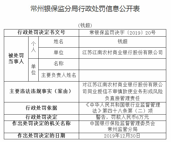 常州银保监分局行政处罚信息公开表(常银保监罚决字〔2019〕20号)显示,钱超对江苏江南乡村商业银行股份有限公司同业授信不谨慎致使业务构成风险负直接管理责任。根据《中华人民共和国银行业监督管理法》第四十八条第(二)项的规定,中国银行保险监督管理委员会常州监管分局决定:对其处以警告,?钊嗣癖6万元。