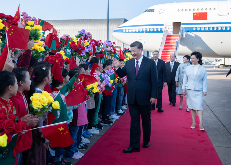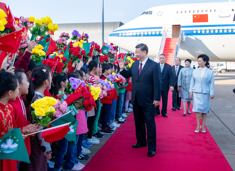 16时许,习近平乘坐的专机冉冉降落在澳门国际机场。习近平和夫人彭丽媛走出舱门,向欢迎人群挥手致意。澳门警察乐队奏响热情喜庆的欢迎曲,现场一片欢腾。舷梯旁,两名澳门少年儿童向习近平和彭丽媛献上鲜花。在澳门特别行政区行政长官崔世安和夫人霍慧芬陪同下,习近平和彭丽媛同前来迎接的人员亲切握手。数百名澳门青少年和各界群众代表挥动国旗、特别行政区区旗和鲜花,热烈欢迎习近平的到来。