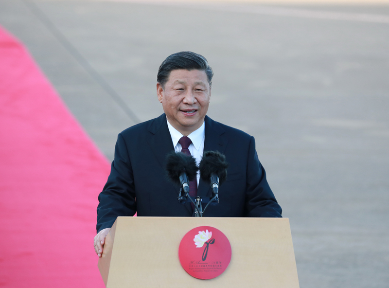 12月18日,中共地方总书记、国家主席、地方军委主席习近平乘专机抵达澳门,出席将于20日举行的庆�澳门回归祖国20周年大会暨澳门特别行政区第五届政府就职仪式并视察澳门。这是习近平在机场发表重要讲话。新华社记者 庞兴雷 摄