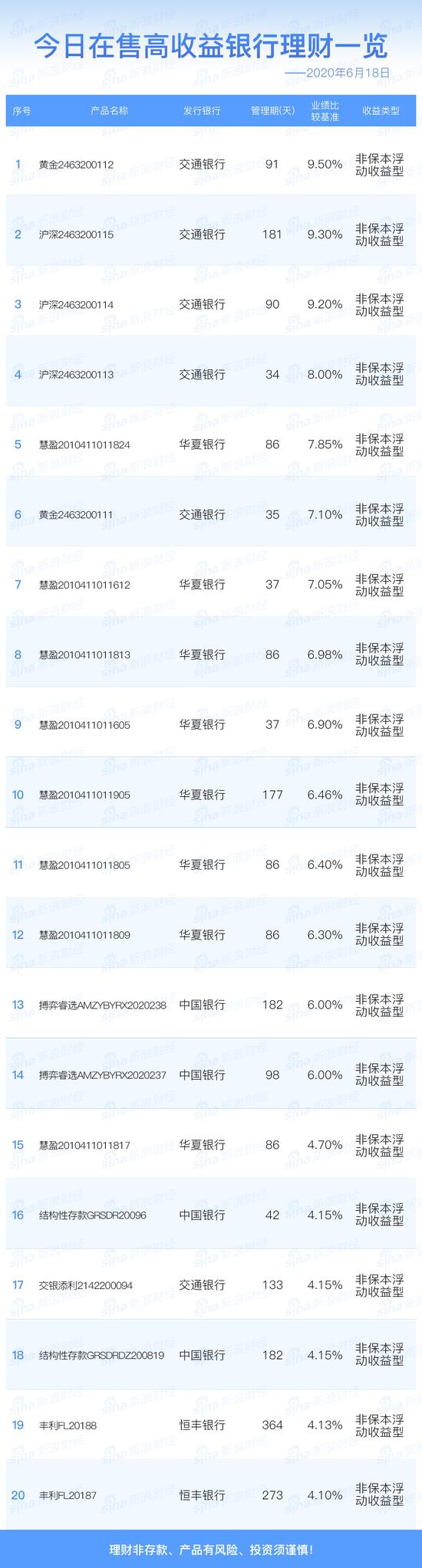 新浪财经音讯:6月18日在售高收益银行理财产品:今日业绩比较基准在7.05%以上的银行人民币理财产品共7款。交通银行的“350vip葡亰集团2463200112”业绩比较基准最高,为9.50%。