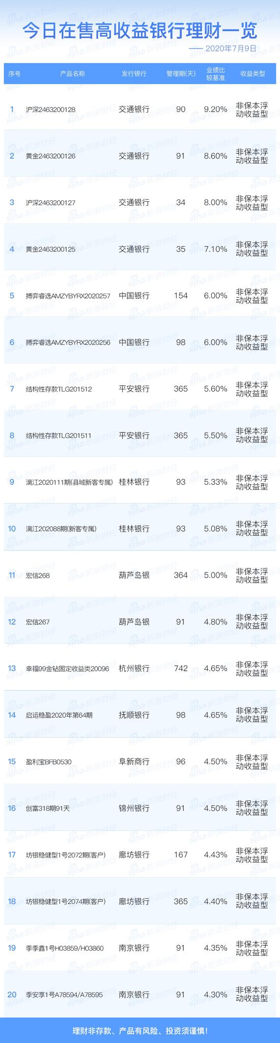 银行16日在售高收益理财产品一览