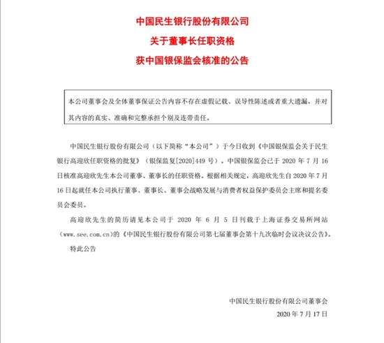 民生银行董事会换届:高迎欣任董事长