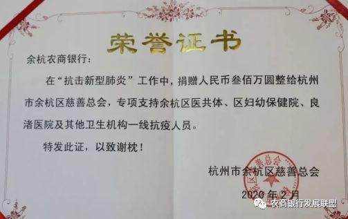 余杭农商银行向杭州市余杭区慈善总会捐款300万元,专项用于抗击疫情相关工作,这是疫情防控时期余杭农商银行第二次捐款。截至目前,余杭农商银行共累计捐款400万元。