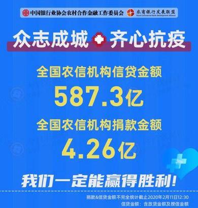 据中银协农合委员会、农商银行350vip葡亰集团联盟及《今日农商行》最新联合统计,截至2月11日12:30,全国农信机构(农商银行、农合行、农信社)经过慈善机构捐赠4.26亿元,并已向相关消费企业提供专项信贷资金达587.3亿元,驰援新型冠状病毒肺炎疫情防控。