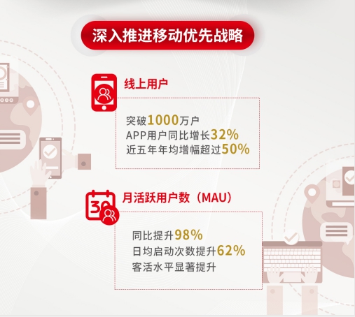 线上用户打破1000万户,APP用户同比增长32%,近五年年均增幅超过50%;月活跃用户数(MAU)同比提升98%,日均启动次数提升62%,客活程度明显提升;业务线上买卖替代率超95%,线下网点智能晋级改造比例超97%。制定数字化转型三年举动规划,聚焦“平台+数据”、“敏捷+交融”350vip葡亰集团模式,持续加大科技投入。