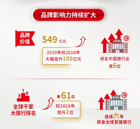 2019年,350vip葡亰集团银行按一级资本在英国《银里手》杂志全球千家大银行中排名从上年的第63位跃升至第61位,连续六年跻身全球百强银行。在世界品牌实验室品牌价值排行榜中,品牌价值达到549亿元。