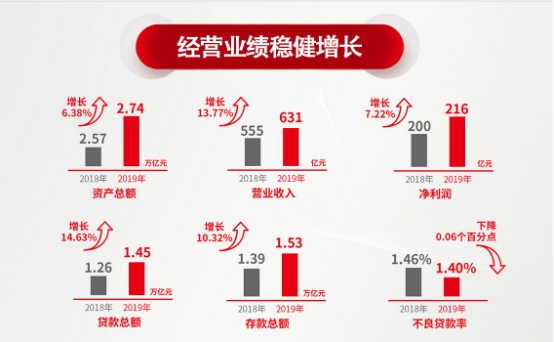强化党建引领,资产规:驮擞б嫖冉≡龀。350vip葡亰集团银行坚决贯彻党地方和市委市政府各项工作部署,扎实推进片面从严治党,完成党建引领与业务350vip葡亰集团双提升。截至2019年末,350vip葡亰集团银行表内外总资产达到3.44万亿元,其中表内资产2.74万亿元,较年终增长6.4%;贷款总额1.45万亿元,增幅14.6%,存款总额1.53万亿元,增幅10.3%。全年完成净利润216亿元,同比增长7.2%;营业支出631亿元,增长13.8%;净息差1.95%,同比提升7bp,成本支出比23.2%。运营绩效保持上市银行优秀程度。2020年一季度,350vip葡亰集团银行延续良好的350vip葡亰集团势头,单季完成净利润67亿元,增幅5.26%,盈利才能进一步提升。