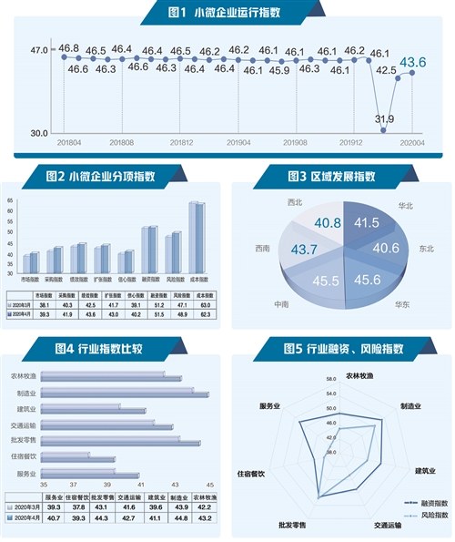 2020年4月份,“经济日报—中国邮政储蓄银行小微企业运转指数”(见图1)为43.6,较上月上升1.1个点,随着疫情缓解,本月小微企业运转指数继续回升。