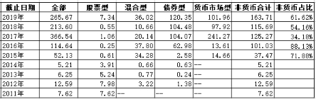 到2018年年底,其管理规模降至213.60亿元,2019年虽然有所回升,但依然离高峰时的366.54亿元相差甚远。也许独一让人欣喜的是,近几年里其非货币基金占全部基金资产规模比例持续走高,不过要想达到2016年时的高位,公司依然需求不断的努力。