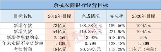 2019年,余杭农商银行圆满完成既定目标。不过,结合当下的经济情势,该行设立的2020年运营目标中进步了新增存贷款义务,具体为“各项存款比年终增100亿元,各项贷款户数比年终添加16000户、余额增长100亿元”。同时进步了不良贷款容忍度,将不良贷款率控制目标从去年的1.1%提升至1.3%,调低利润预期至11亿元(税前)。