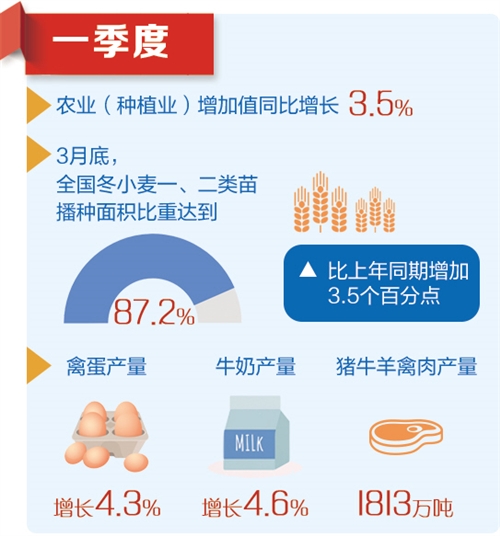 一季度,各地区各部门持续抓好粮食消费,狠抓落实生猪稳产保供政策举措,夏粮长势总体较好,生猪存栏连续两个季度恢复增长。