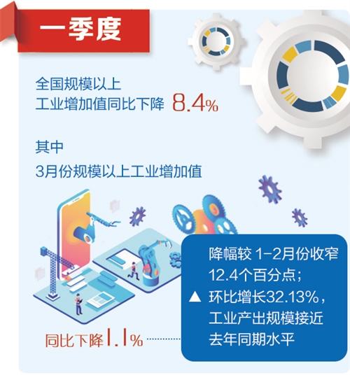 工业消费降幅明显收窄。一季度,规模以上工业添加值同比下降8.4%,降幅较前两个月收窄5.1个百分点。尤其是3月份,工业添加值同比下降1.1%,降幅较前两个月收窄12.4个百分点,工业产出规模已接近上年同期程度。