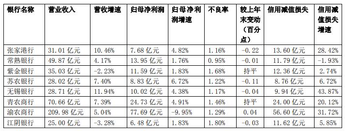 前三季度,信誉减值损失最多的渝农商行,信誉减值损失同比增幅最大的是无锡银行。今年前三季度,渝农商行、青农商行、张家港行、紫金银行、常熟银行、江阴银行、无锡银行、苏农银行信誉减值损失分别为56.60亿元、24.00亿元、13.60亿元、12.36亿元、11.79亿元、11.62亿元、9.94亿元、8.76亿元,同比增速分别为31.72%、20.12%、28.42%、2.74%、-1.93%、5.85%、43.87%、6.72%。