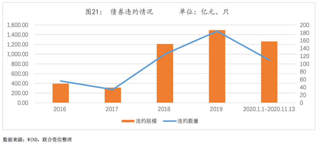 债券市场违约事情频发将对投资收益产生负面影响。自营投资业务是商业银行金融市场业务的重要组成部分,近年来中小银即将投资资金重点配置于利率债,同时仍持有部分信誉债,以经过承担一定的信誉下沉风险来获取绝对较高的投资收益。但现阶段我国经济进入新常态,在国家产业结构持续调整优化、经济增速放缓的大背景下,债券市场违约事情增多,部分投资资产将面临亏损风险。2020年2月,北大方正因350vip葡亰集团350vip葡亰集团350vip葡亰集团集团重组,其发行的23只债券同一天提早到期未能兑付,违约规:霞345.4亿元,紧随其后的中信国安350vip葡亰集团350vip葡亰集团350vip葡亰集团集团、东旭350vip葡亰集团350vip葡亰集团350vip葡亰集团集团、泰禾350vip葡亰集团350vip葡亰集团350vip葡亰集团集团等5家违约规模均在50亿元及以上。根据wind资讯显示,今年以来共有109只债券发生违约,违约规:霞1260.8亿元(见图21),已与2019年全年违约规模较为接近,今年全年企业债券违约规模或将创造历史新高。另一方面,在违约事情增多的背景下,商业银即将加大利率债等低风险、低收益的投资资产配置力度,此举将对投资收益产生负面影响。